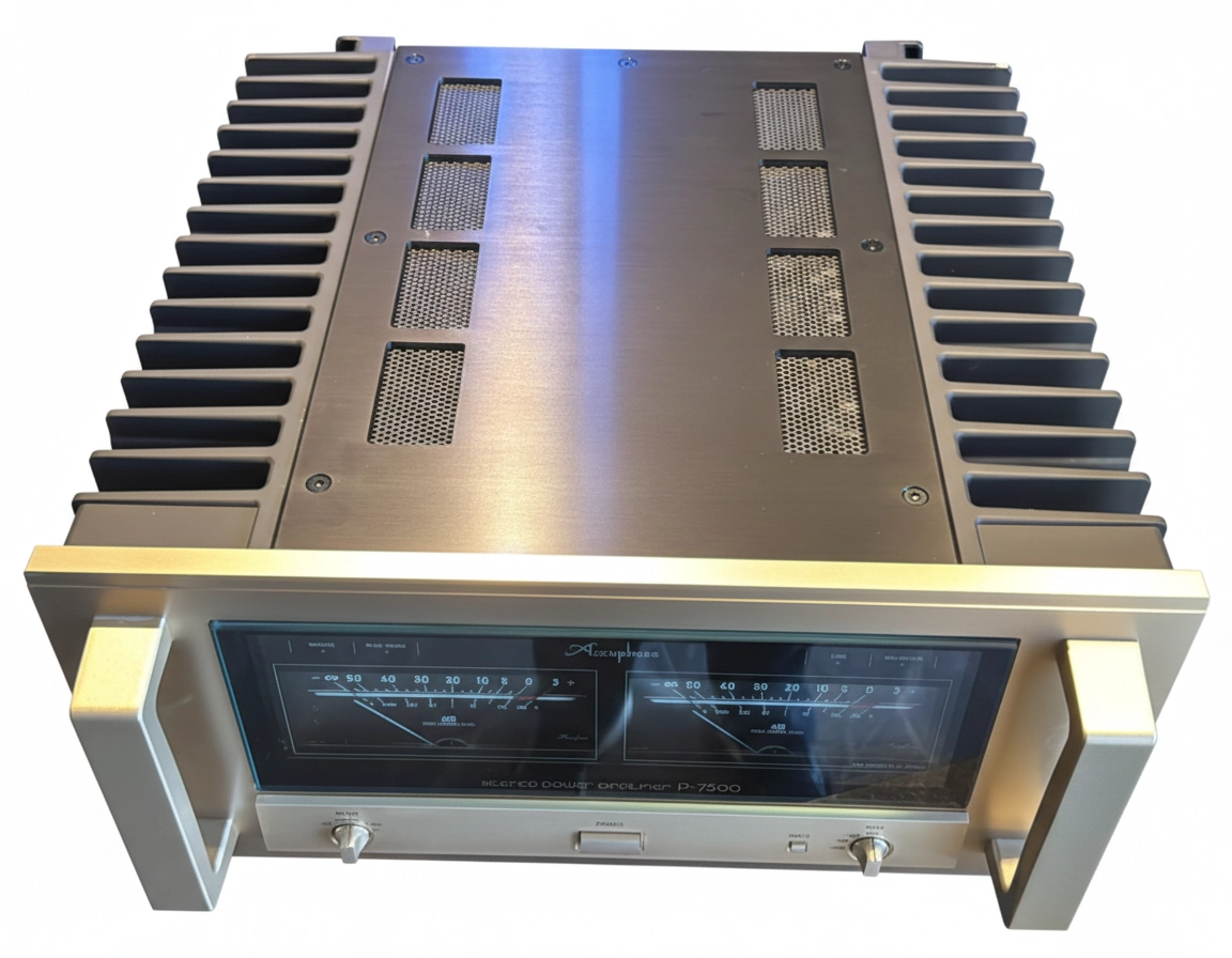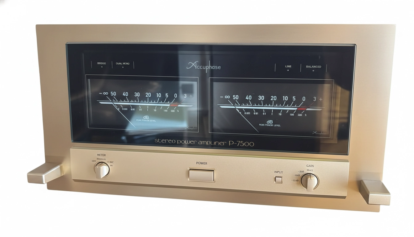 O amplificador de potência estéreo Accuphase P-7500 é o modelo emblemático de Classe AB da marca japonesa, projetado para oferecer uma combinação sem precedentes de potência massiva e refinamento sonoro extremo. Ele é um amplificador de estado sólido que busca a reprodução ideal de qualquer sinal musical, sendo capaz de conduzir com precisão absoluta mesmo as caixas acústicas com as curvas de impedância mais difíceis do mercado. O design externo segue a estética luxuosa e atemporal da Accuphase, apresentando o icônico painel frontal em champagne dourado, grandes medidores de potência analógicos de alta sensibilidade e dissipadores de calor laterais imponentes, garantindo uma presença que reflete a perfeição na construção eletromecânica.
