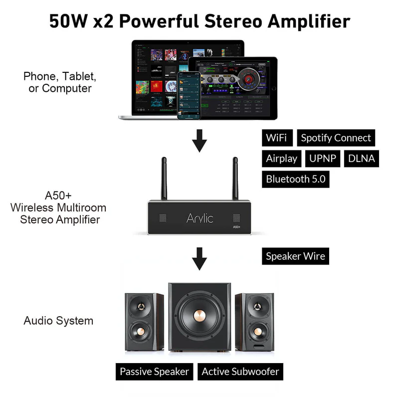 O melhor amplificador estéreo sem fio residencial para caixas de som passivas, ideal para alimentar suas caixas de som de estante e de teto com Wi-Fi, AirPlay ou Bluetooth 5.0 em qualquer ambiente, permitindo ouvir em vários ambientes.