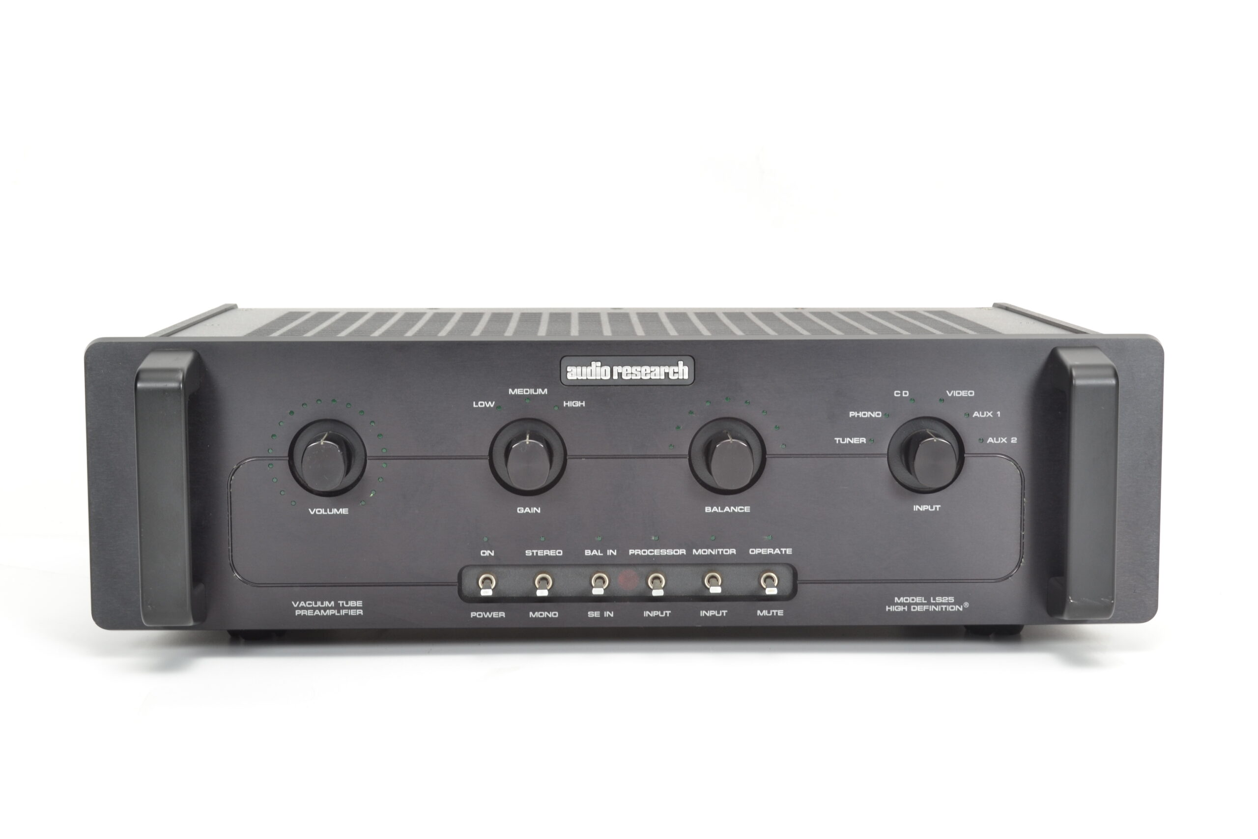 O Audio Research LS25 funciona como um pré-amplificador de linha de alto desempenho que ocupa uma posição de destaque na transição entre os designs clássicos e a era moderna da marca. Ele busca oferecer a flexibilidade e o controle dos modelos da série Reference, utilizando uma arquitetura híbrida que combina a linearidade dos transistores de efeito de campo (FET) com o calor e a riqueza harmônica das válvulas de vácuo. O design externo apresenta o visual industrial icônico da Audio Research, com um painel frontal de alumínio escovado, grandes botões rotativos para seleção de entrada e volume, e chaves de alavanca robustas. Este modelo é particularmente valorizado pela sua capacidade de entregar um som transparente e dinâmico, adaptando-se a uma vasta gama de amplificadores de potência.