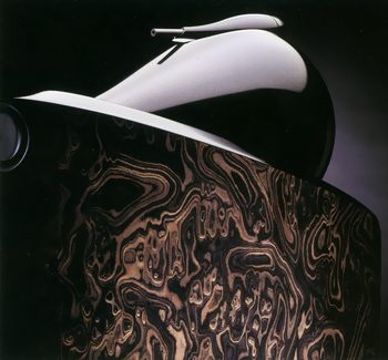 O aparelho apresenta um gabinete arredondado, construção matricial interna, acabamento em couro Connolly na parte superior e frontal do gabinete e um acabamento em madeira Gray Tiger Eye de alto brilho no exterior.