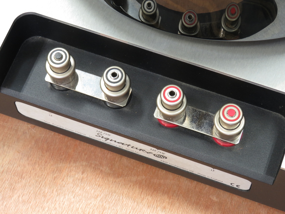 As conexões são feitas através de quatro terminais WBT 0702 banhados a paládio, que aceitam plugs banana, terminais de pá ou fios desencapados. Cada terminal possui duas tampas de rosca: a tampa interna maior prende os fios desencapados ou terminais de pá, enquanto a tampa externa menor aperta uma pinça para fixar firmemente plugs de 4 mm. Os terminais são dispostos com LF+ e LF- mais externos e os terminais MF/HF+ e MF/HF- mais internos. Portanto, se você estiver usando bi-fiação, como eu estava com o cabo de caixa acústica Gibraltar da AudioQuest, seus fios de baixa frequência (LF) precisam de um comprimento considerável. (Jumpers banhados a paládio são fornecidos para fiação simples.) Internamente, o Signature 800 e sua versão Nautilus básica (!) (US$ 16.000 o par) são idênticos, portanto, a descrição anterior — e, de fato, todos os comentários a seguir sobre desempenho — devem se aplicar igualmente à versão mais barata, sem o selo Signature.