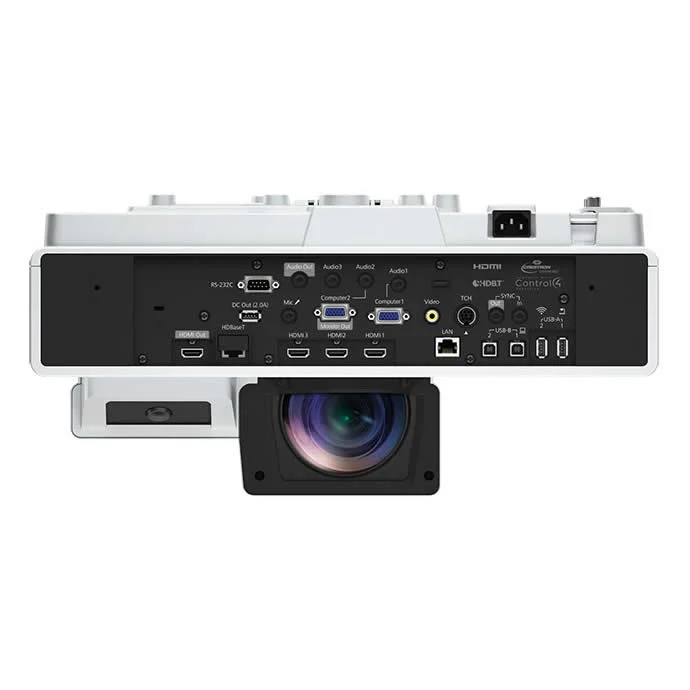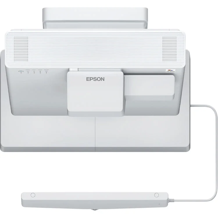 No painel traseiro, o projetor oferece uma ampla gama de conexões, incluindo múltiplas portas HDMI e uma porta HDBaseT, que permite a transmissão de vídeo, áudio e sinais de controle através de um único cabo de rede de longa distância. Ele se integra facilmente a redes corporativas e educacionais, permitindo que administradores de TI gerenciem e monitorem o status de vários projetores remotamente. Além disso, o software de gerenciamento da Epson possibilita a moderação de até 50 dispositivos conectados, dando ao professor ou palestrante o controle total sobre qual conteúdo deve ser exibido na tela principal.