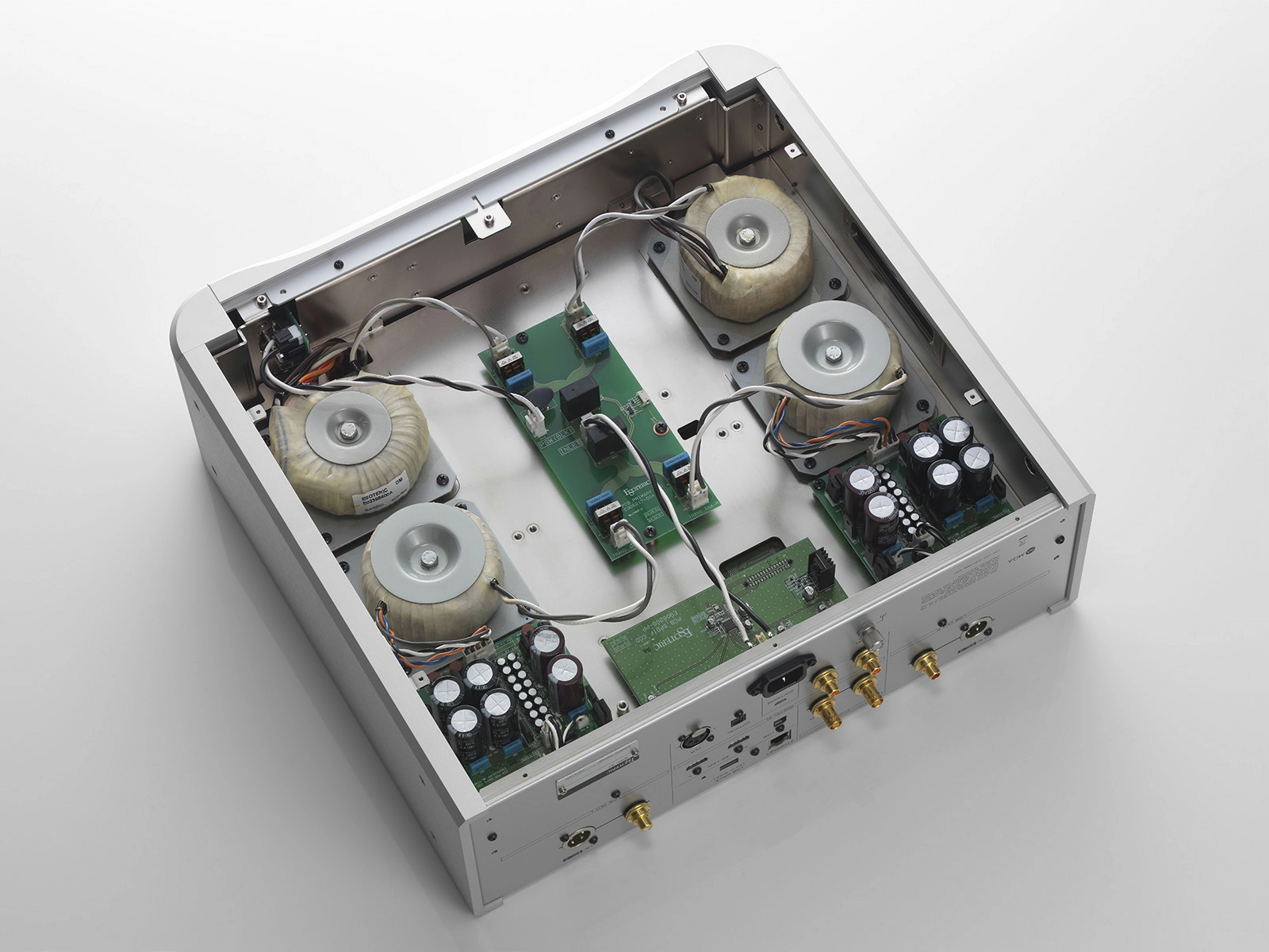 A qualidade de construção do chassi é extremamente rígida e pesada, típica dos equipamentos Esoteric. Este design antivibratório minimiza as ressonâncias e protege os circuitos sensíveis de conversão D/A e de clock. O dispositivo usa múltiplas fontes de alimentação independentes e lineares para isolar digital, clock e seções analógicas, garantindo um fornecimento de energia limpo e estável.