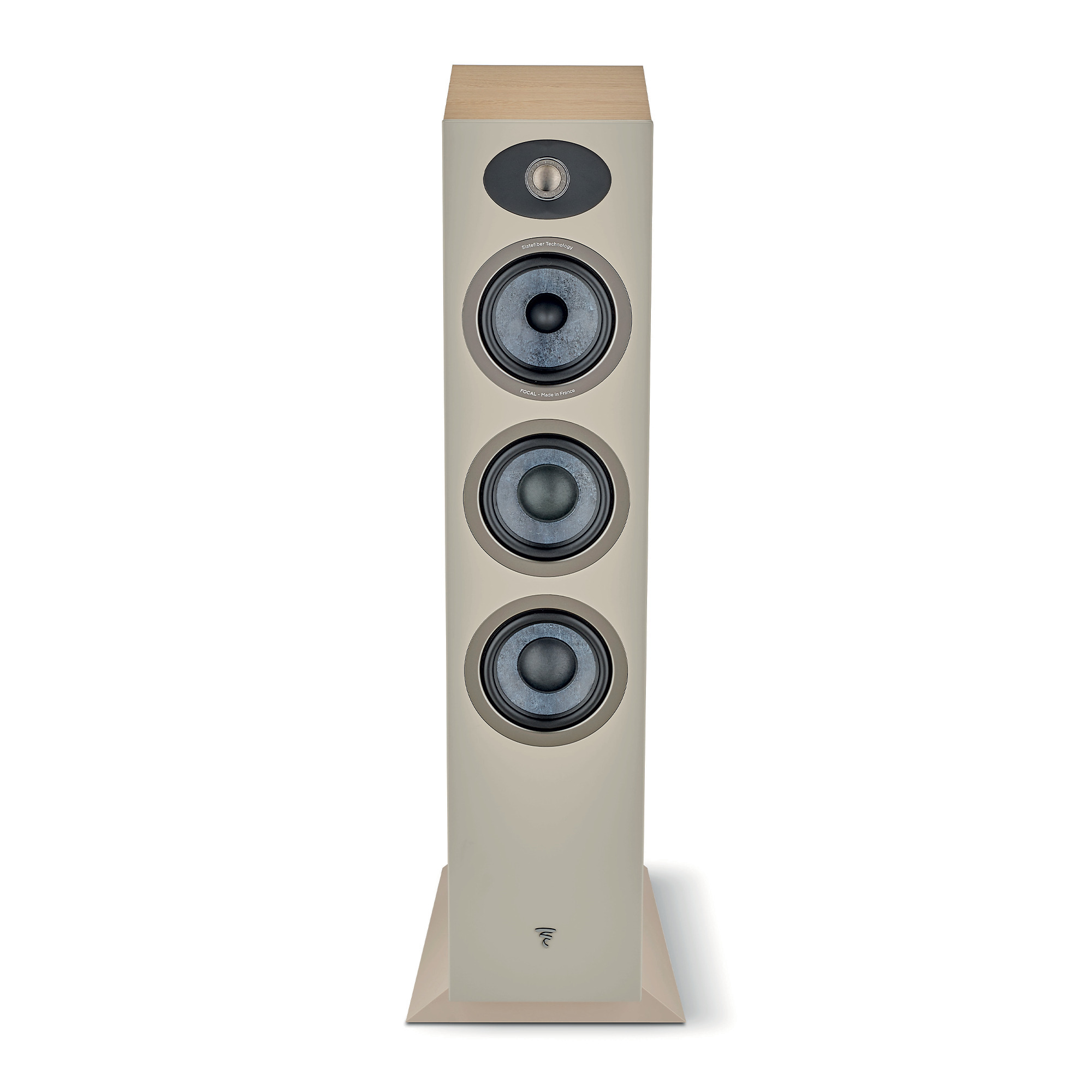 - Drivers Exclusivos Slatefiber: A coluna possui dois woofers e um driver de médio-grave, todos com cones Slatefiber de 13 cm (5 polegadas). Este material, feito com fibras de carbono recicladas e um polímero termoplástico, é exclusivo da Focal. Sua composição proporciona uma combinação ideal de rigidez, leveza e amortecimento, o que resulta em um som dinâmico, rico e equilibrado.
