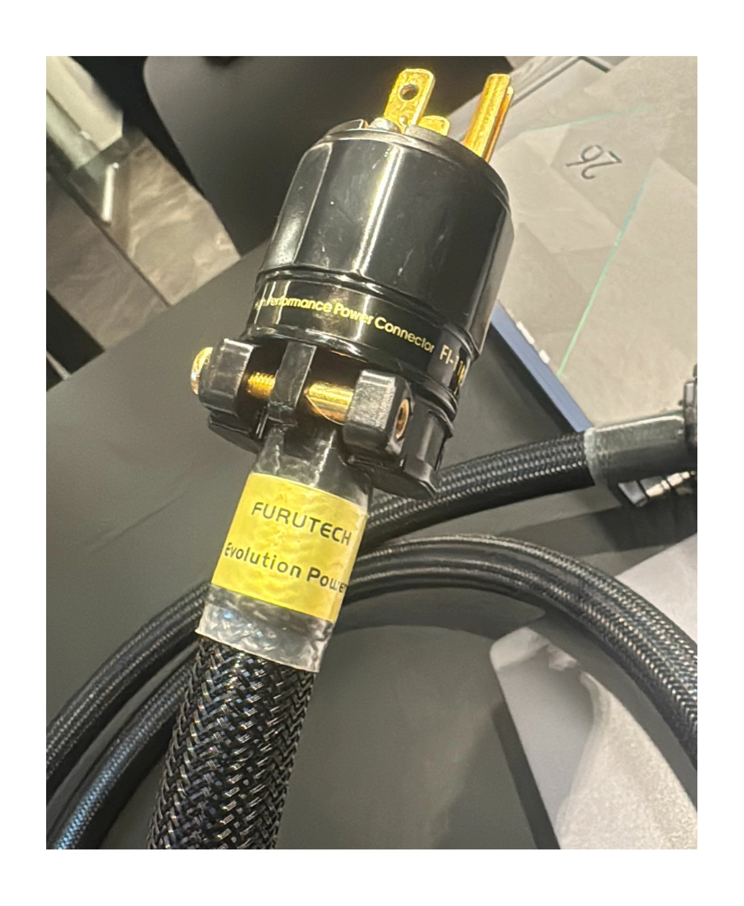 O sistema apresenta conectores de alta gama da série FI-11 da Furutech, que utilizam contatos de cobre puro ou bronze fosforoso banhados a ouro de 24 quilates. O diferencial destes conectores é o corpo em nylon e fibra de vidro, que incorpora partículas de carbono para absorver vibrações mecânicas e ressonâncias piezoelétricas. A conexão física entre o cabo e o plugue opera através de um mecanismo de fixação por pressão que maximiza a área de contato, reduzindo a impedância no ponto de entrada de energia. Ao integrar este cabo ao sistema, o usuário percebe uma maior transparência sonora e uma estabilidade de imagem em displays de vídeo, elevando o desempenho global do conjunto.
