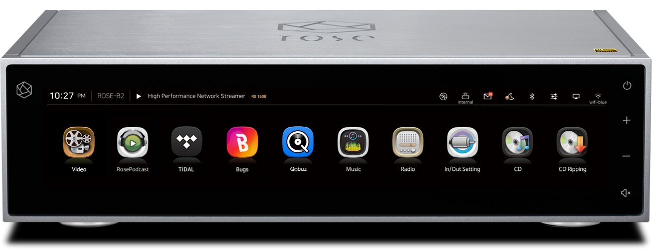 O carro-chefe RS150B é fresado a partir de um bloco sólido de alumínio de alta pureza, usa um relógio femto e oferece um grande display intuitivo. Ele oferece saída I2S, entrada ARC e oferece Wi-Fi e Bluetooth apenas por meio de um dongle externo. Uma entrada de linha analógica é oferecida, permitindo que ele funcione como um pré-amplificador.