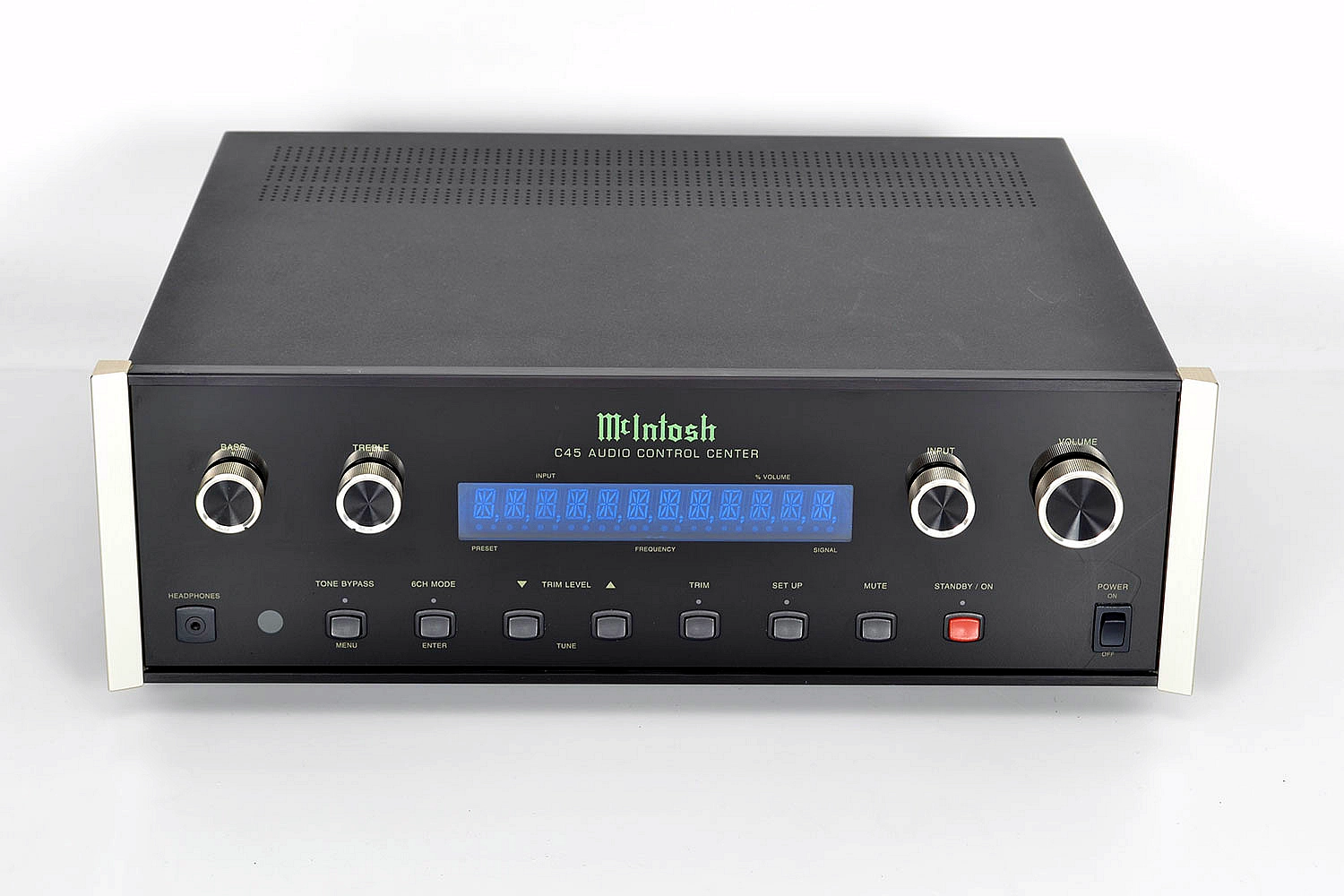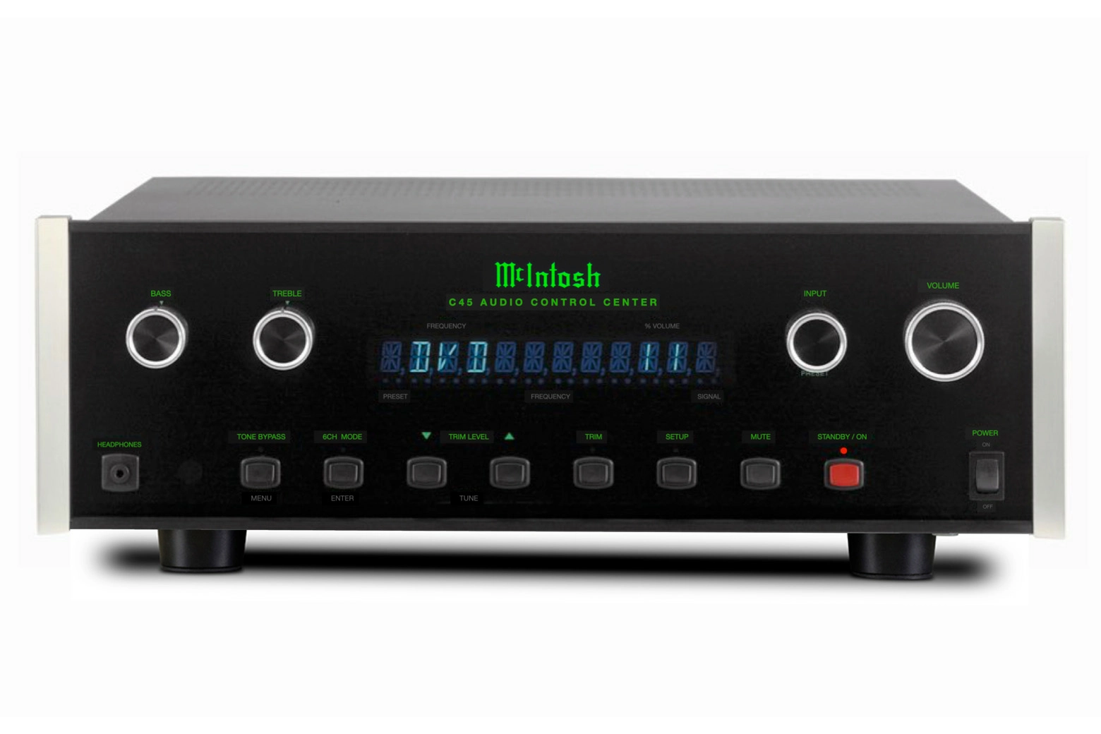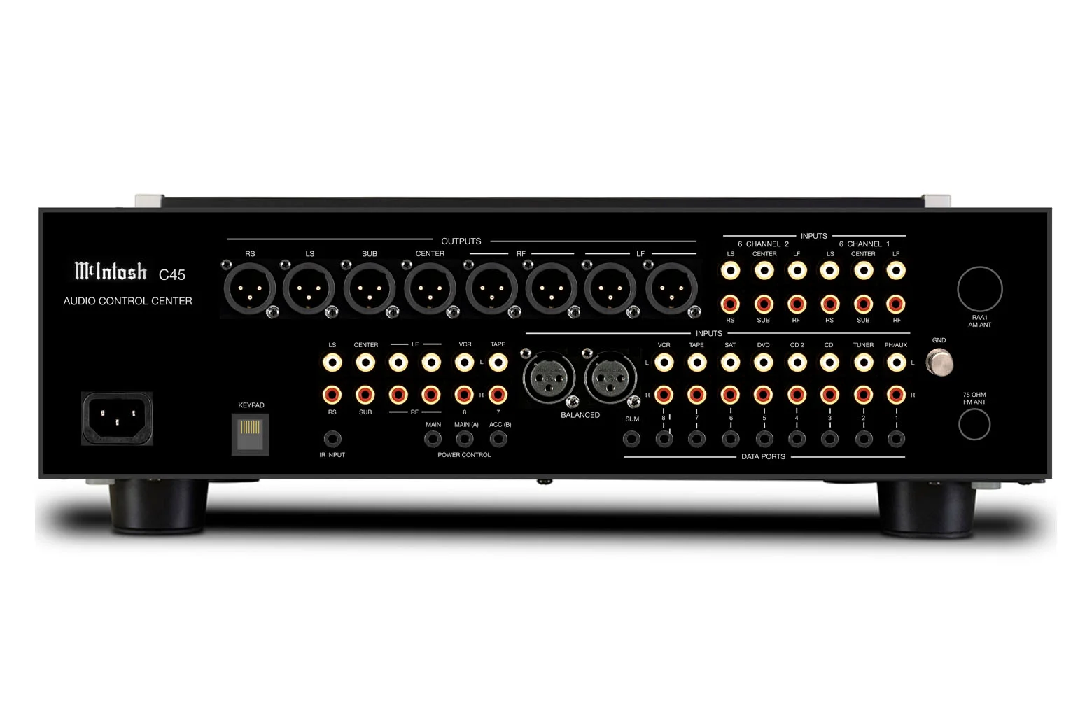 O McIntosh C45 funciona como um centro de controle de áudio de alta performance, destacando-se por sua rara capacidade de gerenciar tanto sistemas estéreo tradicionais quanto sistemas multicanais de seis canais. Ele busca oferecer uma solução analógica pura para audiófilos que desejam integrar música de alta fidelidade e trilhas sonoras de cinema sem comprometer a qualidade sonora. O painel frontal exibe o clássico vidro preto da McIntosh, com botões de controle iluminados por fibras óticas e medidores digitais, mantendo a estética icônica da marca enquanto fornece uma interface de usuário intuitiva e robusta.