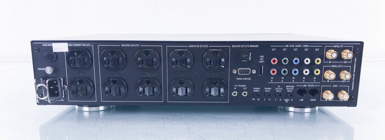 As funcionalidades de controle do equipamento incluem o sequenciamento de inicialização das tomadas, que liga os componentes em uma ordem específica para evitar estalos nos alto-falantes e sobrecargas no circuito. Ele é um gerenciador que oferece saídas de alta corrente para amplificadores e subwoofers, além de entradas e saídas protegidas para cabos coaxiais e linhas telefônicas. A organização lógica do painel traseiro facilita a gestão de cabos, tornando a integração em racks de áudio e vídeo mais eficiente e segura.