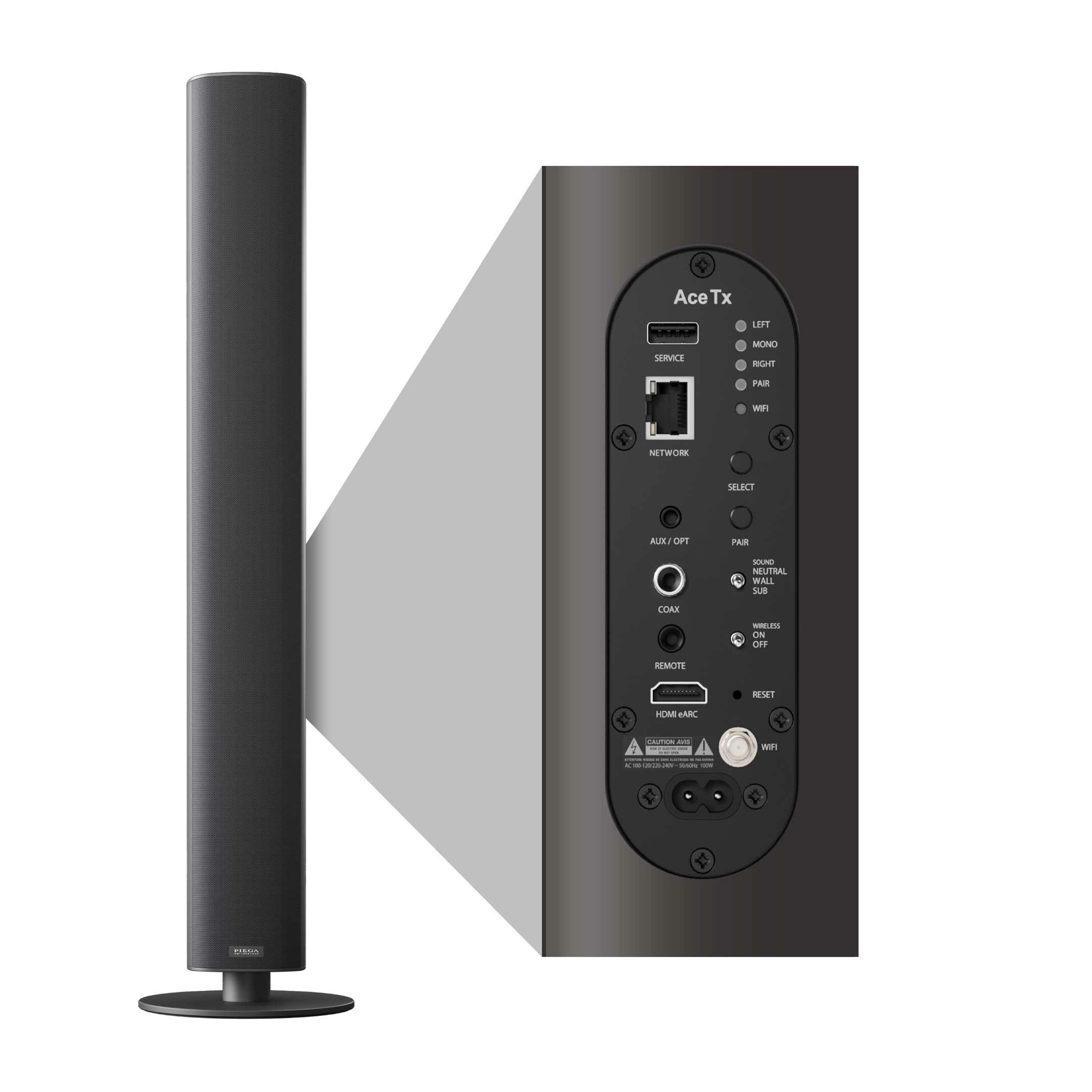 O coração do sistema apresenta uma distinção funcional clara entre as unidades, onde a caixa TX (Transmitter) é o hub principal de inteligência e conectividade. O dispositivo apresenta todas as entradas físicas e módulos de streaming integrados, sendo a unidade que atua na recepção do sinal de áudio e no processamento inicial. Já a caixa RX (Receiver) é a parceira de reprodução, sendo a unidade que recebe o sinal de áudio digital sem fio da unidade TX através da tecnologia WiSA. Este sistema é o componente que assegura uma sincronização perfeita entre os canais esquerdo e direito, resultando em uma experiência estéreo sem perdas de 24 bits.