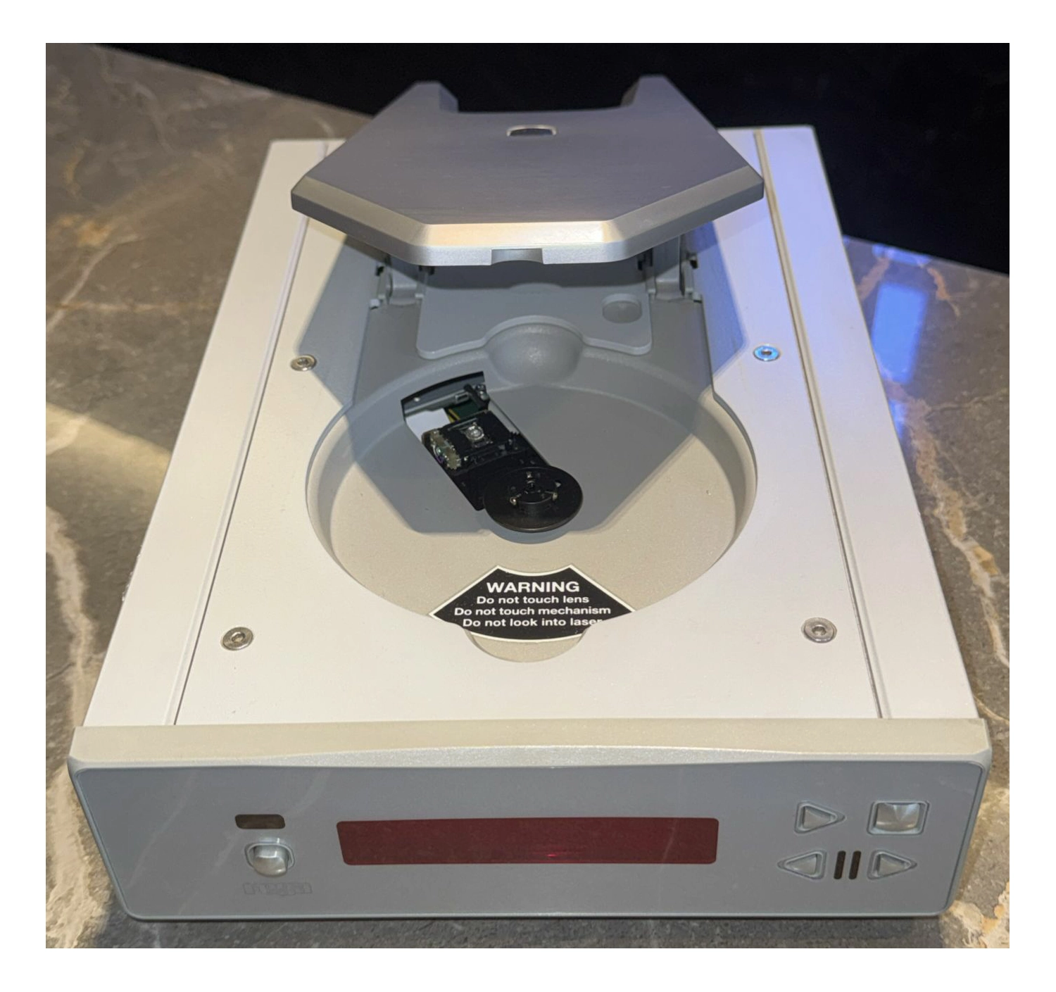A característica visual mais marcante do aparelho é o seu sistema de carregamento superior (top-loading). Ele é um design que elimina a necessidade de bandejas motorizadas complexas, reduzindo vibrações mecânicas e aumentando a durabilidade do conjunto. A tampa de abertura manual permite o acesso direto ao eixo, onde o disco é fixado de forma segura, garantindo que o laser faça a leitura em uma superfície extremamente estável.