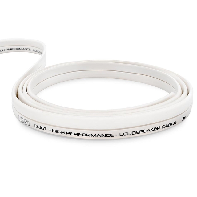Cabo de alto-falante plano e flexível de alta qualidade projetado pela Rega contendo 250 fios por canal e totalizando 4 mm de seção transversal quadrada feito de cobre de 99,99% da mais alta qualidade.