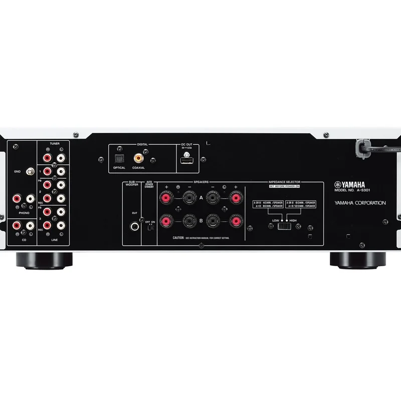Embora mantenha uma alma analógica, o A-S301 é equipado com entradas digitais óptica e coaxial, permitindo a conexão direta de televisores, players de Blu-ray ou consoles de videogame para aproveitar o DAC interno do amplificador. Ele também oferece uma entrada phono dedicada para toca-discos com cápsulas MM e uma saída para subwoofer, facilitando a expansão do sistema para uma configuração 2.1. O dispositivo possui uma porta USB de alimentação no painel traseiro, destinada ao adaptador Bluetooth da Yamaha, permitindo a transmissão de música sem fio com facilidade.